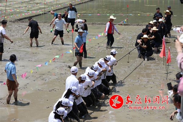 以藍(lán)天為背景,水田作舞臺(tái)。來自湖北省十堰市、白河縣、旬陽市各鎮(zhèn)和仙河鎮(zhèn)各村(社區(qū))20個(gè)隊(duì)伍、400名運(yùn)動(dòng)員展開一場(chǎng)場(chǎng)運(yùn)動(dòng)競(jìng)賽。只見隊(duì)員們挽起褲腳,赤腳下田,放肆追逐,盡情歡呼,插秧比賽、稻田拔河比賽、稻田摔跤比賽、渾水摸魚等環(huán)節(jié),重現(xiàn)歡鬧的勞作場(chǎng)景,上演著一場(chǎng)場(chǎng)關(guān)于泥、水、魚和人的快樂“較量”,觀眾也在還原農(nóng)耕場(chǎng)面原始風(fēng)俗、熱情勞作和農(nóng)忙氛圍中找到了童年最純真的模樣。