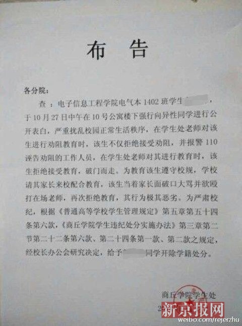 新京報快訊(記者 程媛媛 實習生 顧開貴 趙吉翔)今日(11月10日),河南商丘學院一份“布告”在網上流傳,“布告”稱該校男生郭某“強行”向異性表白,嚴重擾亂校園秩序,校方依據(jù)相關規(guī)定給予郭某開除學籍處分。該校多名學生向新京報記者證實校內多個分院均貼有此布告。