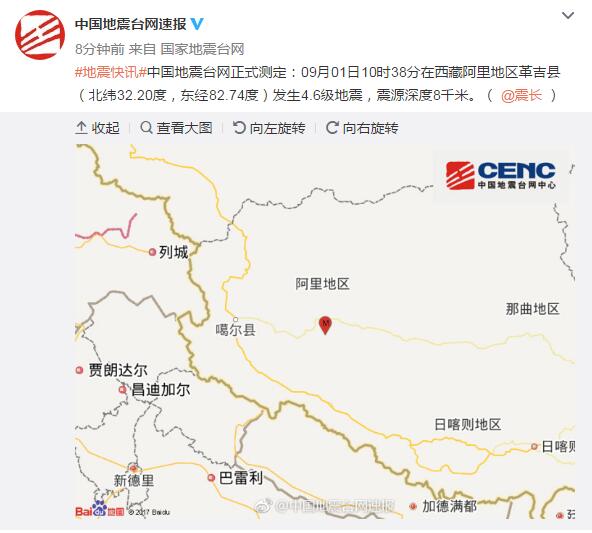 人民網北京9月1日電 據中國地震臺網正式測定,9月1日10時38分在西藏阿里地區(qū)革吉縣(北緯32.20度,東經82.74度)發(fā)生4.6級地震,震源深度8千米。z75安康新聞網