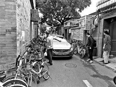 一名在胡同口維持秩序的醫(yī)院保安不時會提醒行人,不要將共享單車停放在醫(yī)院門口,并幫忙將道路中間的共享單車向兩邊靠攏,為路面留出更多空隙。但隨著人數(shù)增多,道路依然不可避免地越來越擠。北青報記者觀察發(fā)現(xiàn),近半個小時的時間里,就有四輛機動車被胡亂停放的單車卡在道路中間,被困車輛甚至連車門都難以打開,只能求助醫(yī)院保安或者周圍居民來挪開車旁的共享單車。8點左右,一名ofo小黃車運營人員在接到醫(yī)院保安的電話后趕到現(xiàn)場。據(jù)他介紹,僅現(xiàn)場的小黃車就需要七八次才能全部搬走,搬出來的單車會被投放在附近其他需要用車的地點,“搬運工作大概會用一上午吧!