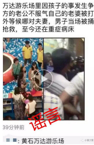 【傳聞】湖北黃石、湖南湘潭、益陽以及山東煙臺等地傳出“在萬達(dá)廣場一樓游樂場,兩位母親因為娃娃的事發(fā)生爭吵,隨后,一女子老公因不服氣自己的老婆被打,叫人在萬達(dá)外等候里面那對夫妻,男子當(dāng)場被捅死,女的還在搶救,至今還在重癥病床”。