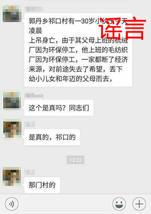 【傳聞】網(wǎng)傳“河北保定蠡縣郭丹鄉(xiāng)祁口村有一30歲小伙子今天凌晨上吊身亡。其父母上班的梳絨廠因為環(huán)保停工,他上班的毛紡織廠也因為環(huán)保停工,因為家里都斷了經(jīng)濟(jì)來源,遂對前途失去了希望,丟下年幼的兒女和年邁的父母而去”。