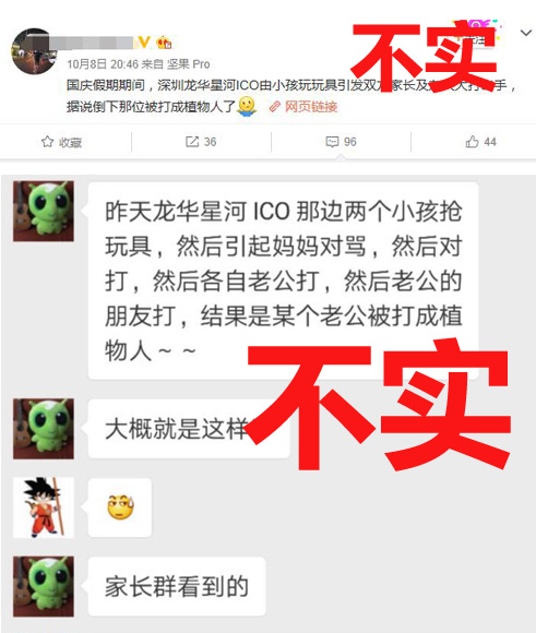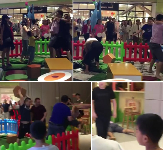 網(wǎng)傳視頻顯示,在一所商場內(nèi)的兒童游樂區(qū)內(nèi),有若干名男子、兩名女子在激烈打斗。另有家長慌忙將孩子帶離區(qū)外,還有工作人員和顧客在驚愕圍觀、勸架。其中一名身穿粉色上衣男子被一名黑衣男子高舉的立方體積木砸倒,俯臥在地,不再動彈。在微博和微信群內(nèi),有人稱打架地點為深圳龍華星河ICO,事情是“兩個孩子搶玩具,引媽媽對罵、對打,然后各自老公打,然后老公朋友打,結果是某個老公被打成植物人”,引發(fā)網(wǎng)民關注。一些評論惋惜稱“兩個家庭算廢了”,“沖動是魔鬼”。
