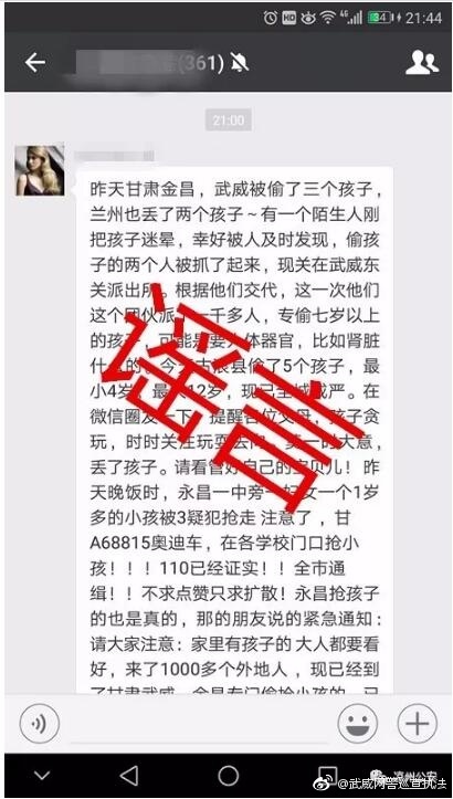 28日晚間,甘肅武威網(wǎng)警在官方微博通報了相關情況。近日,網(wǎng)警在巡查時發(fā)現(xiàn)本地朋友圈、微信群傳播一則多個小孩被偷、被搶的消息,經(jīng)核實,涼州區(qū)及周邊臨縣近期未發(fā)生類似案件,也未接到有群眾報警,更沒有將搶小孩的嫌疑人關押在東關派出所的情況。此消息屬于虛假消息。警方查實,網(wǎng)傳消息與之前國內(nèi)部分地市傳播的一則偷小孩謠言版本雷同,此謠言只是將外省的地名改成了武威、蘭州、金昌或是古浪等當?shù)氐孛?/span>這類謠言的傳播,一度引發(fā)部分群眾的恐慌,嚴重干擾了社會秩序。