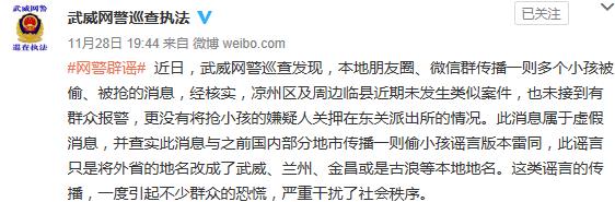 人民網(wǎng)北京11月29日電 (記者孝金波)近日,網(wǎng)絡有消息稱“甘肅金昌武威被偷了三個孩子……嫌疑人被關在武威東關派出所”等內(nèi)容,引發(fā)網(wǎng)民關注。28日,武威網(wǎng)警辟謠稱,此消息屬于虛假消息。