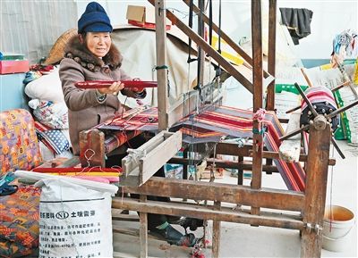 在西安市鄠邑區(qū)玉蟬鎮(zhèn)的一個村莊里,67歲的農(nóng)婦周妙娃正在使用一臺四十年多前的土織布機織環(huán)保床單,土織布機由木頭制作,這種木質(zhì)結(jié)構(gòu)的土織布機已經(jīng)有上千年的歷史,村子里以前有不少人織土布。如今,大家都轉(zhuǎn)型種葡萄了,大多數(shù)家都把土織布機拆了,僅周妙娃家還保留了一臺。