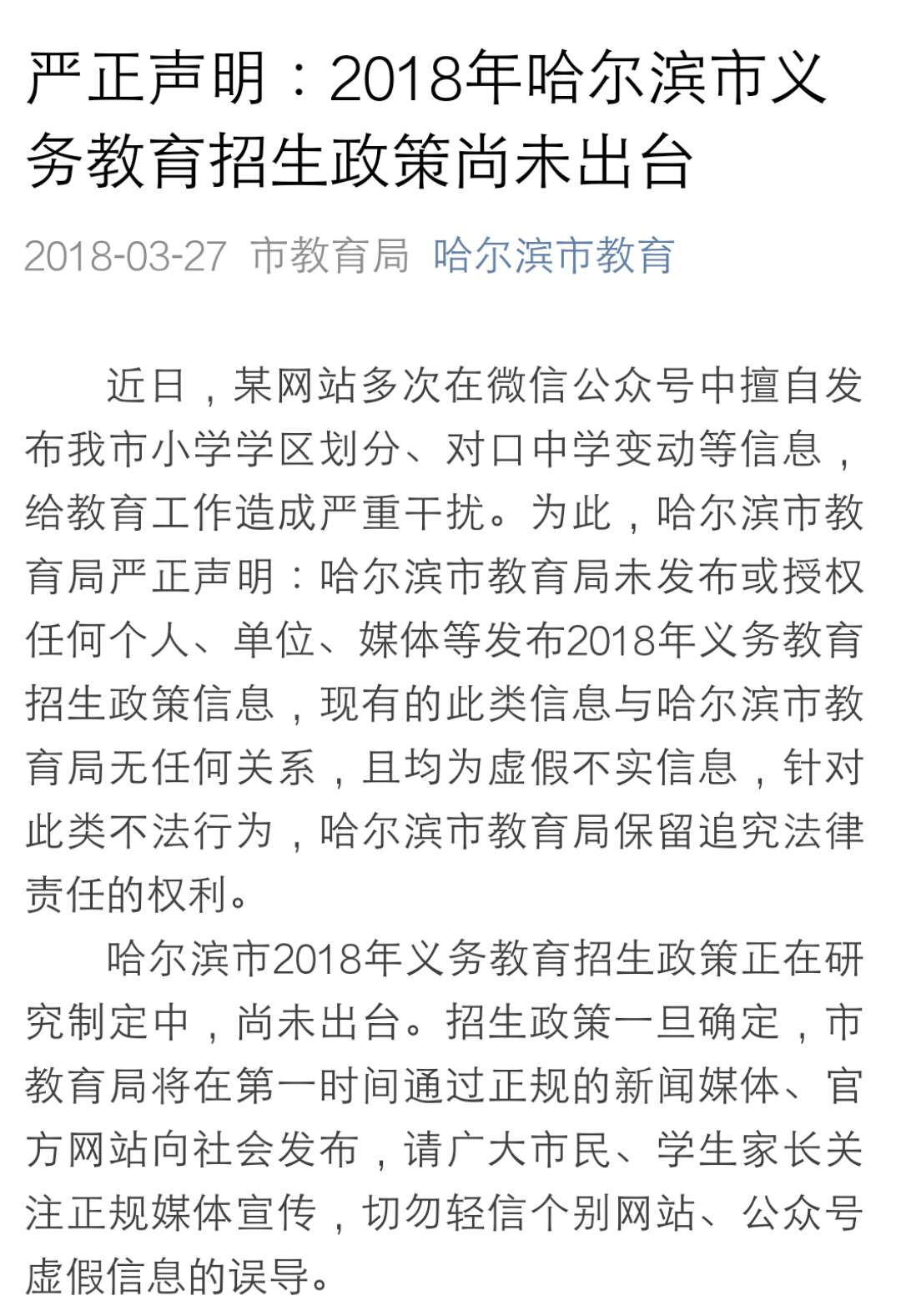 官方聲明表示,近日,某網(wǎng)站多次在微信公眾號中擅自發(fā)布我市小學學區(qū)劃分、對口中學變動等信息,給教育工作造成嚴重干擾。為此,哈爾濱市教育局嚴正聲明:哈爾濱市教育局未發(fā)布或授權(quán)任何個人、單位、媒體等發(fā)布2018年義務(wù)教育招生政策信息,現(xiàn)有的此類信息與哈爾濱市教育局無任何關(guān)系,且均為虛假不實信息,針對此類不法行為,哈爾濱市教育局保留追究法律責任的權(quán)利。