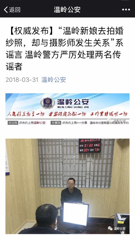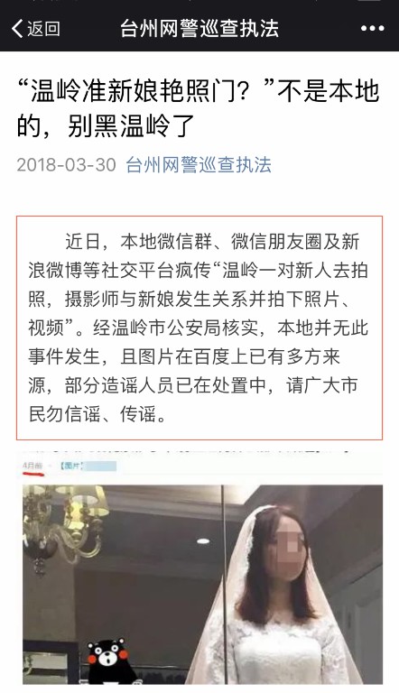 3月30日,臺州市公安局網(wǎng)警官微發(fā)布消息,所謂“溫嶺準(zhǔn)新娘艷照門”不是本地的,別黑溫嶺了。其中指出,“本地并無此事件發(fā)生”,該謠言中的“圖片在百度上已有多方來源”,并稱“部分造謠人員已在處置中”。