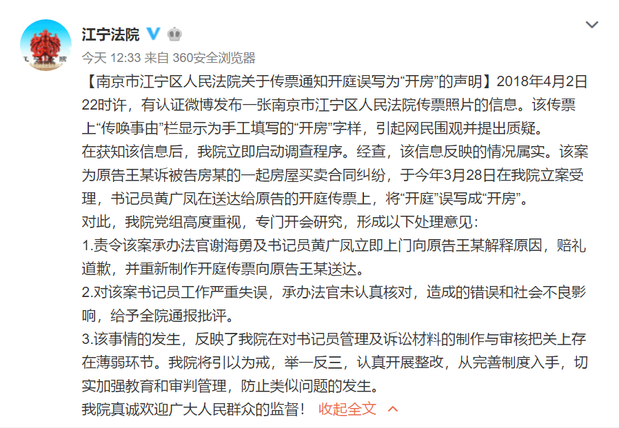 4月3日,南京市江寧區(qū)人民法院官方微博發(fā)表“關(guān)于傳票通知開(kāi)庭誤寫為‘開(kāi)房’的聲明”。其中指出,傳票所涉案件為原告王某訴被告房某的一起房屋買賣合同糾紛,于今年3月28日在江寧法院立案受理,書記員黃廣鳳在送達(dá)給原告的開(kāi)庭傳票上,將“開(kāi)庭”誤寫成“開(kāi)房”。
