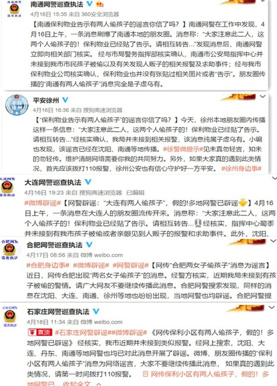 4月16日,沈陽(yáng)網(wǎng)警官微回應(yīng)稱:經(jīng)核實(shí),沈陽(yáng)市公安局指揮中心并未接到有該市市民孩子被偷或者親眼見到人販子的報(bào)警及市民求助事件。丹東網(wǎng)警官微也表示:經(jīng)與該市保利物業(yè)公司核實(shí)確認(rèn),保利物業(yè)也并沒有張貼過(guò)相關(guān)圖片或者“告示”。