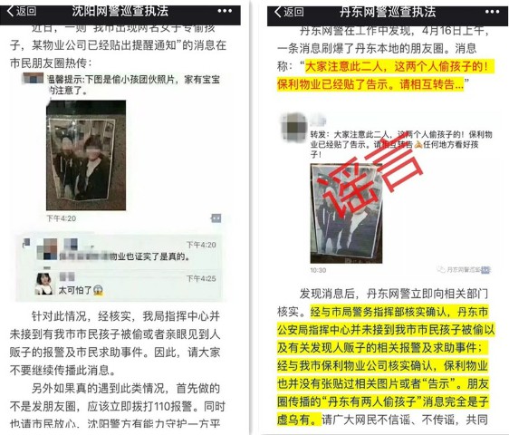 該則消息在沈陽(yáng)的網(wǎng)民朋友圈中打著“溫馨提示”的名號(hào),聲稱“下圖是偷小孩團(tuán)伙照片,家要有寶寶的注意了”。丹東流傳的版本則為“大家注意此二人,這兩個(gè)人偷孩子的!保利物業(yè)已經(jīng)貼了告示。請(qǐng)相互轉(zhuǎn)告...”