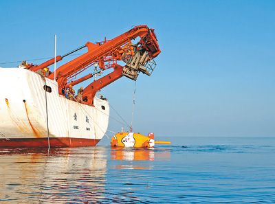 圖為24日科考隊(duì)員在布放“潛龍三號(hào)”,從母船將其放入水中。(記者 劉詩(shī)平 攝)