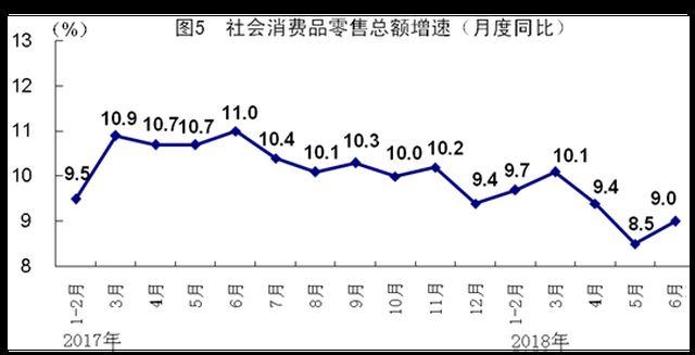 上半年,全國居民人均消費支出9609元,同比名義增長8.8%,比一季度加快1.2個百分點,扣除價格因素實際增長6.7%,加快1.3個百分點。其中,城鎮(zhèn)居民人均消費支出名義增長6.8%,加快1.1個百分點;農(nóng)村居民人均消費支出名義增長12.2%,加快1.2個百分點。上半年,社會消費品零售總額180018億元,同比增長9.4%,增速比一季度回落0.4個百分點。按經(jīng)營單位所在地分,城鎮(zhèn)消費品零售額154091億元,增長9.2%;鄉(xiāng)村消費品零售額25927億元,增長10.5%。按消費類型分,餐飲收入19457億元,增長9.9%;商品零售160561億元,增長9.3%。消費升級類商品銷售增長較快,限額以上單位家用電器和音像器材類、通訊器材類和化妝品類同比分別增長10.6%、10.6%和14.2%,分別比上年同期加快0.2、0.5和2.9個百分點。6月份,社會消費品零售總額同比增長9.0%,比上月加快0.5個百分點。