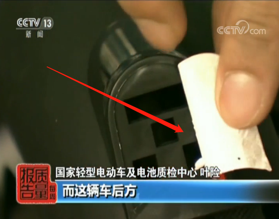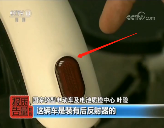 國家輕型電動車及電池質(zhì)檢中心 葉險:我們可以看到這輛車,這輛車是裝有后反射器的,所以它可以使得后方的機動車發(fā)現(xiàn)它。而這輛車它后方其實是沒有反射器的,我們看這個好像是疑似反射器,但它僅僅只是一張貼紙,我們一次就可以把它撕下來,它是起不到任何反射作用。所以這輛車的話,是沒有保證它的騎行者的安全的。