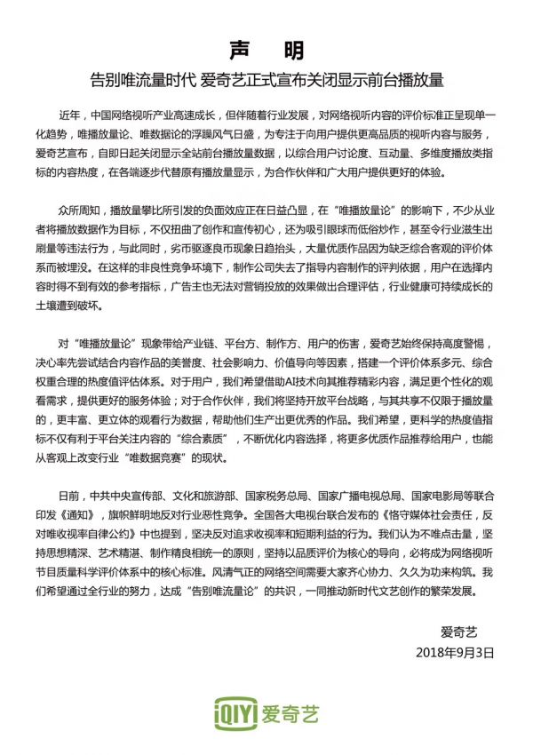 愛奇藝首席內(nèi)容官王曉暉對媒體稱,過度關(guān)注播放量給行業(yè)帶來了諸多不良影響,大量的優(yōu)質(zhì)作品因為缺乏客觀、公正的評估體系被埋沒。不少從業(yè)者更將播放量簡單攀比,扭曲了創(chuàng)作初心,甚至滋生出刷量等違法或者違反職業(yè)道德的行為。對于“唯播放量論”的不良現(xiàn)象,以及由此帶給產(chǎn)業(yè)鏈、平臺、制作方、用戶的傷害,我們保持高度的警惕。為了改變這種不良風氣,愛奇藝決定率先關(guān)閉前臺播放量顯示,將重心回歸創(chuàng)作并為用戶提供優(yōu)質(zhì)的內(nèi)容和服務(wù)體驗。