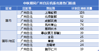 中秋期間廣州白云機場出港熱門航線。