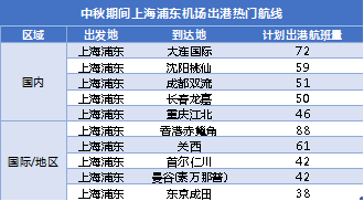 中秋期間上海虹橋、浦東機場出港熱門航線。