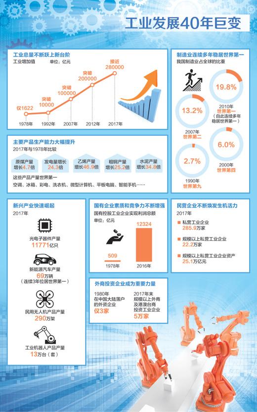1978年1622億元,1992年突破1萬億元,2007年突破10萬億元,2012年突破20萬億元,2017年接近28萬億元……這條持續(xù)躍升的曲線,就是改革開放40年來中國工業(yè)增加值的增長軌跡。