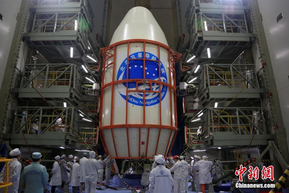 11月1日深夜23時(shí)57分,中國(guó)在西昌衛(wèi)星發(fā)射中心用長(zhǎng)征三號(hào)乙運(yùn)載火箭,成功發(fā)射第41顆北斗導(dǎo)航衛(wèi)星。這顆衛(wèi)星屬于地球靜止軌道衛(wèi)星,是中國(guó)北斗三號(hào)系統(tǒng)第17顆全球組網(wǎng)衛(wèi)星,也是北斗三號(hào)系統(tǒng)首顆地球靜止軌道衛(wèi)星。圖為衛(wèi)星發(fā)射前,火箭在發(fā)射場(chǎng)進(jìn)行吊裝(資料圖片)。中新社發(fā) 史嘯 攝
