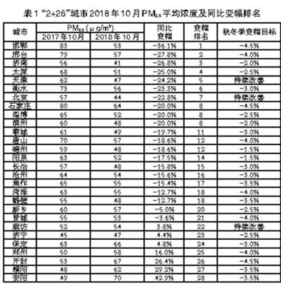 《通報(bào)》對(duì)京津冀及周邊地區(qū)“2+26”城市、長(zhǎng)三角地區(qū)41個(gè)城市、汾渭平原11個(gè)城市2018年10月細(xì)顆粒物(PM2.5)平均濃度和同比變化幅度分別進(jìn)行了排名。