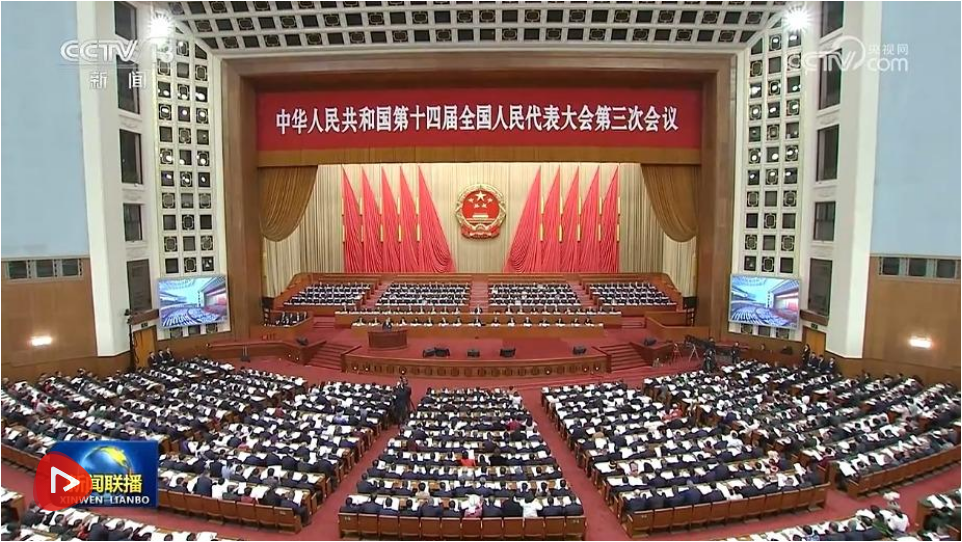 上午9時,趙樂際宣布:中華人民共和國第十四屆全國人民代表大會第三次會議開幕。會場全體起立,高唱國歌。