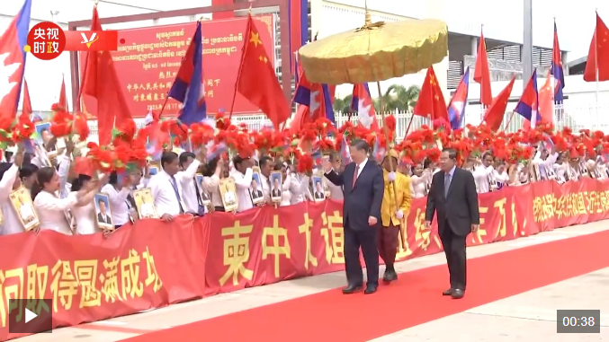 洪森在機場為習近平主席舉行隆重歡送儀式。習近平在洪森陪同下檢閱儀仗隊。習近平向歡送人群揮手致意。