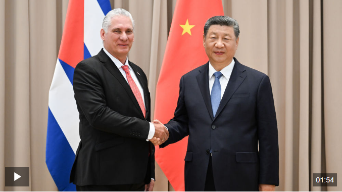 習(xí)近平指出,近年來(lái),我同主席同志多次會(huì)晤,共同引領(lǐng)中古關(guān)系進(jìn)入政治互信更深厚、戰(zhàn)略協(xié)作更緊密、民意基礎(chǔ)更牢固的新階段。今年是中古建交65周年,中方愿同古方進(jìn)一步鞏固鐵桿情誼,構(gòu)建更加緊密的中古命運(yùn)共同體,樹立社會(huì)主義國(guó)家團(tuán)結(jié)合作、發(fā)展中國(guó)家真誠(chéng)互助的典范。雙方要促進(jìn)各層級(jí)交往、各領(lǐng)域合作進(jìn)一步走深走實(shí),讓高水平政治互信始終成為中古兩黨兩國(guó)關(guān)系的鮮明標(biāo)識(shí)。中方堅(jiān)定支持古巴捍衛(wèi)國(guó)家主權(quán)、反對(duì)外來(lái)干涉和封鎖,支持古巴經(jīng)濟(jì)社會(huì)發(fā)展。作為全球南方重要成員,雙方要在金磚、中拉論壇等框架內(nèi)加強(qiáng)協(xié)調(diào)和配合,反對(duì)強(qiáng)權(quán)政治和單邊霸凌,維護(hù)國(guó)際公平正義。