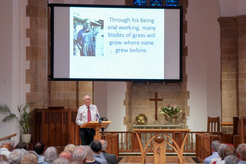 7月22日,在英國赫特福德郡哈彭登鎮(zhèn),喬治·艾爾溫·何克的外甥馬克·艾爾溫·托馬斯在紀(jì)念活動上發(fā)表演講。新華社記者 吳魯 攝