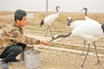 趙仕偉給斷喙的丹頂鶴喂食(攝于2017年11月)。 本報(bào)記者 胡婧怡攝 “鐵桶”和“迷彩服”靠近了……