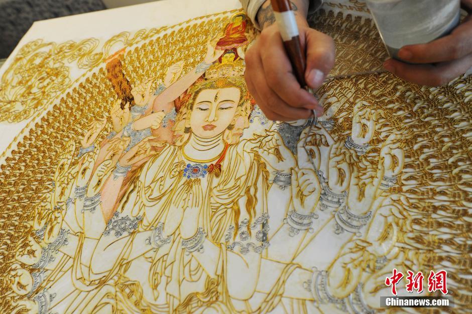 6月17日,甘肅民間畫師李海明正在以敦煌莫高窟第3窟《千手千眼觀音》為范本制作掐絲琺瑯壁畫。在制作《千手千眼觀音》的過程中,李海明在原壁畫的基礎(chǔ)上,進(jìn)行了……