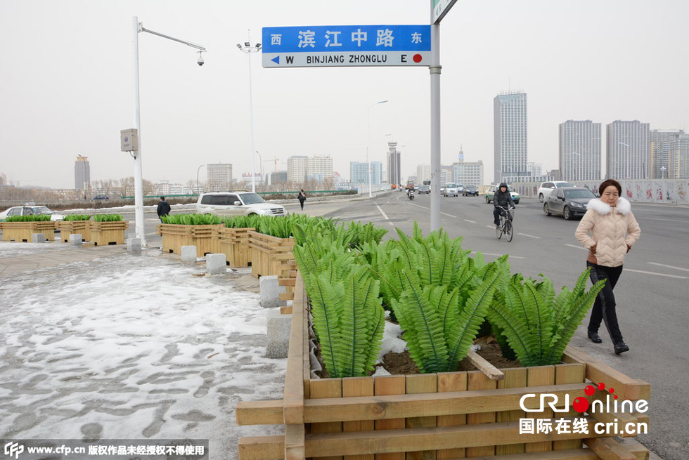 2015年3月15日,吉林省吉林市,在吉林市吉林大街上,市民從形似“油麥菜”的綠色塑料假花前行走。圖片來源:王凱冬近日,市民發(fā)現(xiàn)位于吉林市吉林大街與濱江中路……