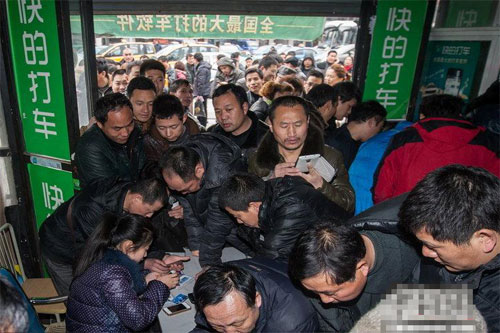 2014年2月19日,杭州“快的打車”服務點,出租車司機們排隊安裝軟件。圖片來源:CFP視覺中國2014年2月19日,杭州,隨著“嘀嘀”、“快的”……