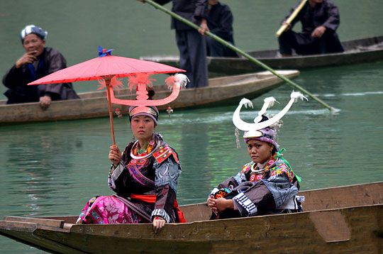 圖為船頭撐傘的苗族新娘。中新社發(fā) 趙剛 攝貴州省黔南布依族苗族自治州三都縣打魚鄉(xiāng)苗族村寨來術(shù)村一直奉行著古老的“水上送親”婚俗,每當(dāng)舉行“水上送親、……