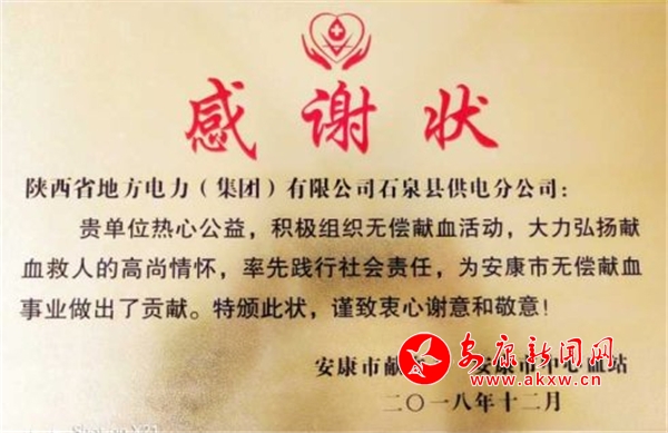 幾年來,石泉縣供電分公司無償獻(xiàn)血活動(dòng),得到上級(jí)組織的從分肯定。 2016年石泉縣供電分公司受到邀請,參加了紀(jì)念“6.14”世界獻(xiàn)血者日,安康市人民政府舉辦的全市無償獻(xiàn)血促進(jìn)會(huì),作了無償獻(xiàn)血工作經(jīng)驗(yàn)交流發(fā)言,作為全市唯一的企業(yè)代表,電力人深感自豪和光榮;同年被安康市無償獻(xiàn)血領(lǐng)導(dǎo)小組辦公室、安康市紅十字會(huì)、安康市衛(wèi)生和計(jì)劃生育局聯(lián)合授予“安康市無償獻(xiàn)血愛心合作單位”,成為石泉縣第一家被授予無償獻(xiàn)血愛心合作的單位;2017年榮獲“市級(jí)無償獻(xiàn)血工作促進(jìn)獎(jiǎng)先進(jìn)集體”;2018年12月安康市、安康市中心血站送來“感謝狀”這一系列成績的取得為石泉縣供電分公司省級(jí)精神文明標(biāo)兵單位增色添彩,同時(shí)石泉縣供電分公司也是全縣僅此一家“省級(jí)精神文明標(biāo)兵單位”保持者,公司更高的目標(biāo)是創(chuàng)建“全國精神文明單位”這是幾代石泉電力人的夢想。