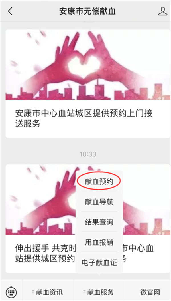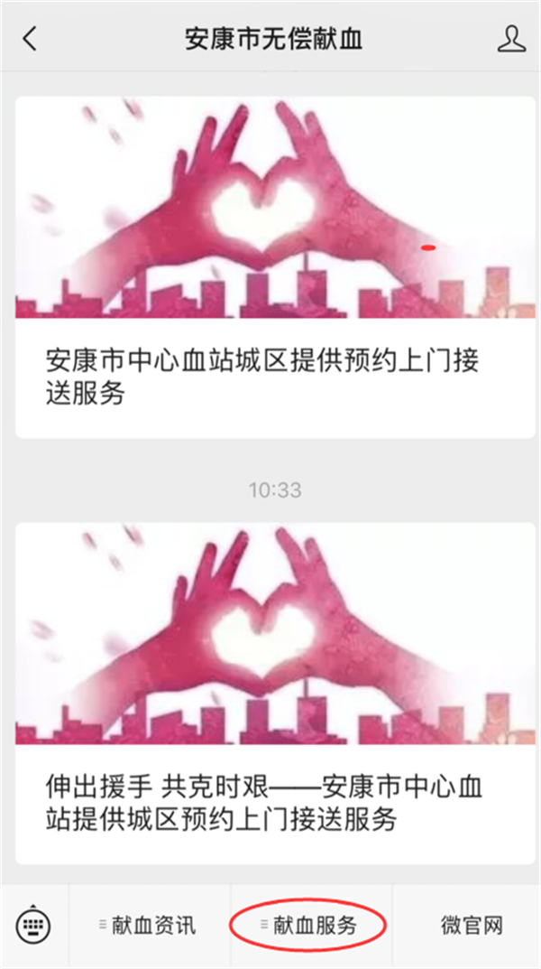 同時(shí)安康市中心血站公眾號(hào)開(kāi)放獻(xiàn)血預(yù)約渠道,(如圖示)在關(guān)注安康市無(wú)償獻(xiàn)血公眾號(hào)后,在最下方菜單欄選擇“獻(xiàn)血服務(wù)”——“獻(xiàn)血預(yù)約”——填寫(xiě)相關(guān)信息,便可完成預(yù)約。