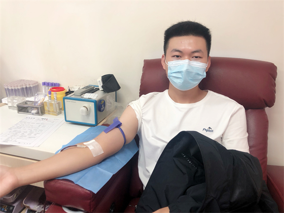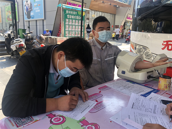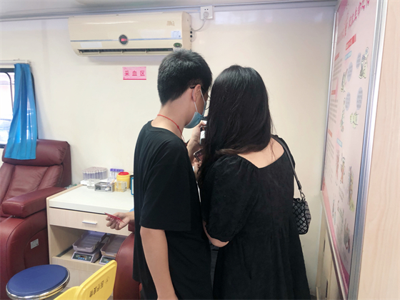 中秋節(jié)不僅街上熱鬧,獻血車上也熱鬧,鄧孟杰正坐在采血椅上獻血,他漂亮大方的女友站在旁邊跟他聊著晚上要吃什么,女友的弟弟坐在遠一點的地方玩著手機,女友的媽媽則坐在體檢桌前測量血壓,“一人獻血,三人陪同”的場景著實有點可愛,但鄧孟杰笑得十分開心,一直想獻血的他特別選了中秋這個日子,大概也是想和愛人親人一起分享這種美妙的人生體驗。鄧孟杰的女友拿起他的獻血證撒嬌到:“這次我們陪你,下次你也要陪我來獻血。”說完把手機塞給了一旁的弟弟,指揮他給自己和男友拍合照,一邊打趣弟弟拍照技術不好一邊把男友手里獻血證的位置調了又調。