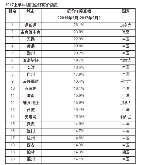 該報(bào)告中的房價(jià)變化對比的是2017年6月與2016年6月這12個月以來的數(shù)據(jù)。除了無錫排在全球第3位以外,香港排在第4位,鄭州排在第5位,長沙排在第7位,廣州第8位,石家莊第10位,濟(jì)南第11位,合肥第13位,武漢第15位,廈門第16位,杭州第17位,西安排在第18位。
