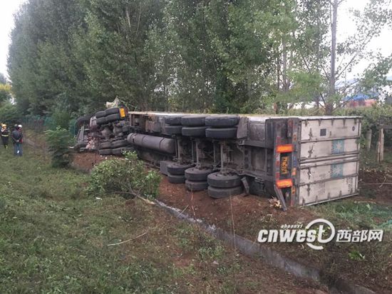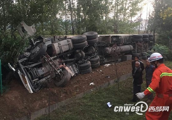 今天(9月13日)5時(shí)52分,一輛拉運(yùn)大蒜的河南牌照半掛車在西寶高速距眉縣服務(wù)區(qū)兩公里處沖下護(hù)欄側(cè)翻,車上2人被困,寶雞公安消防支隊(duì)眉縣中隊(duì)接到報(bào)警后將被困人員救出送往醫(yī)院救治。