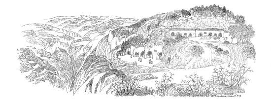 陜北革命舊址寫生,面對復(fù)雜的景物,須瞬間分析,即刻做出判斷、選擇、取舍、構(gòu)圖,抓住整體、突出特點,果斷下筆。以線寫生,務(wù)求準(zhǔn)確,落筆后,線不可重復(fù),也無法修改。寫生時,常常左手打傘,天熱時遮陽光,每當(dāng)大汗淋漓,也顧不上擦;下雨時,盡量用傘遮住畫紙,堅持畫完,即便衣服濕透也無所謂。如果對寫生作品不滿意時,就重新赴舊址寫生,僅涇陽縣云陽革命舊址,他就去過4次,清澗縣石嘴驛去了3次,直到畫好為止。