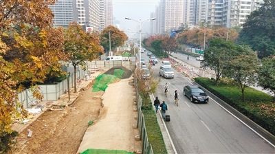 這里的圍擋給該路段的交通造成了一定的影響。記者注意到,從科技四路十字往南,圍擋占據了高新路西側整個非機動車道和部分人行道,35路公交站也被圍擋在內。由北向南的非機動車和行人途經此路段時,不得不走上機動車道,與疾馳而過的各種機動車搶道。而高新路由北向南只有兩條機動車道,其中一條幾乎被非機動車和行人占據。
