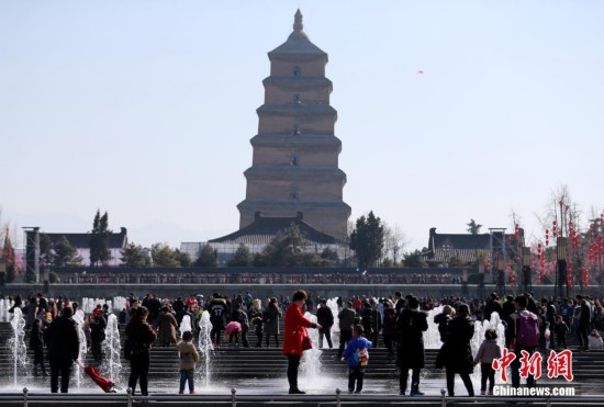 2月22日,民眾進(jìn)入大雁塔北廣場的噴泉區(qū)域游玩。當(dāng)日,陽光明媚,西安大雁塔北廣場迎來了大量游客,人氣十足。中新社記者 張遠(yuǎn) 攝fdz安康新聞網(wǎng)