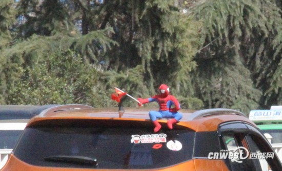 蜘蛛俠玩偶“坐”上汽車車頂很是顯眼