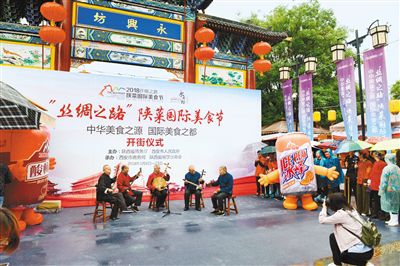 “關(guān)中巷的鄉(xiāng)黨們,陜南街的伙計(jì)們,陜北里的后生婆姨們,擼起袖子加油干,今兒個(gè),咱開市大吉”。昨日上午,記者在永興坊陜西非遺美食文化街區(qū)看到,盡顯老陜豪邁風(fēng)格的“開街儀式”吸引了不少游人駐足。永興坊園區(qū)東邊方言字廣場(chǎng)特設(shè)為“2018‘絲綢之路’陜菜國際美食節(jié)”主題宣傳區(qū),匯聚了陜西107區(qū)縣的百余種非遺美食和土特產(chǎn)品。