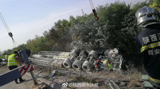 一輛裝載電石的貨車在西安繞城附近側(cè)翻。(圖據(jù)陜西都市快報(bào))3di安康新聞網(wǎng)