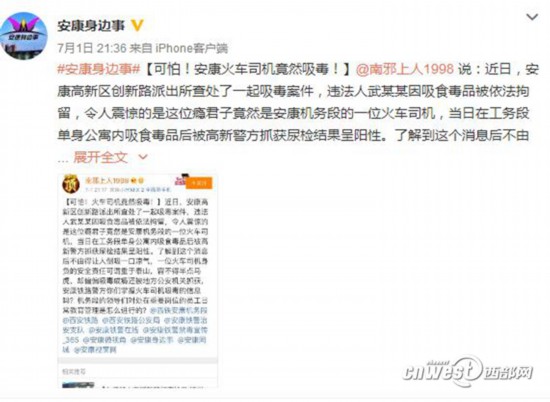 網(wǎng)友微博報料安康一火車司機(jī)吸毒被拘留。