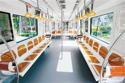 機(jī)場線車輛美觀大方,飽滿圓潤的大流線型車體給人以速度感和沖擊力,簡單的“松石藍(lán)”腰線貫穿整個純白車身,內(nèi)部車輛座椅暖色的蜂窩狀花紋使車輛更具層次感。