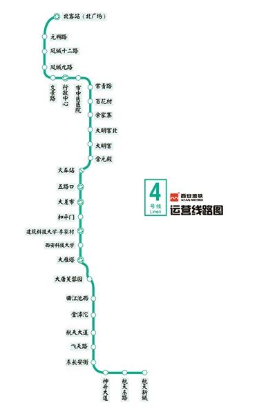 線路依次貫穿西安航天基地、曲江新區(qū)、雁塔區(qū)、碑林區(qū)、未央?yún)^(qū)、經(jīng)濟技術(shù)開發(fā)區(qū),途經(jīng)西安北站、大明宮國家遺址公園、火車站、五路口、大雁塔、大唐芙蓉園、曲江池遺址公園等人流密集區(qū),全線設(shè)車站29座,均為地下站,設(shè)航天城車輛段1座,草灘停車場1座。開通初期因西安火車站改造,故該站甩站運行,各次列車不停站通過。按照現(xiàn)行票價政策,四號線全程票價為8元。