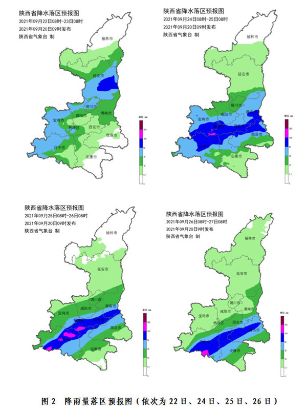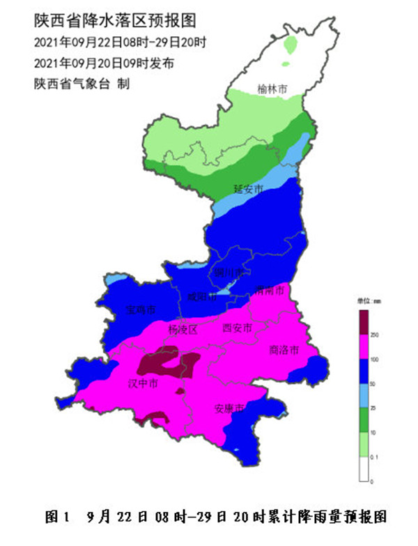 受副高外圍暖濕氣流和高空槽共同影響,22日白天起我省將開始新一輪持續(xù)性陰雨天氣,預(yù)計將維持至月底。過程期間有3個以上暴雨日,其中22日強(qiáng)降水主要位于陜北南部、關(guān)中西部、陜南西部,以大到暴雨為主;24-26日強(qiáng)降水主要位于關(guān)中、陜南地區(qū),部分地區(qū)有暴雨,不排除局地出現(xiàn)大暴雨的可能性;27日至月底強(qiáng)降水主要位于陜南地區(qū)。過程累計降水量:陜北中北部5~40毫米;延安南部、關(guān)中北部60~80毫米,局地可達(dá)100毫米以上;關(guān)中南部、陜南大部100~200毫米,局地可達(dá)200~300毫米(圖1)。降水前期間具有對流性質(zhì),預(yù)計局地最大小時雨強(qiáng)20~40毫米。
