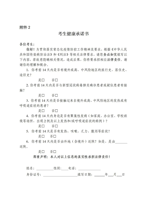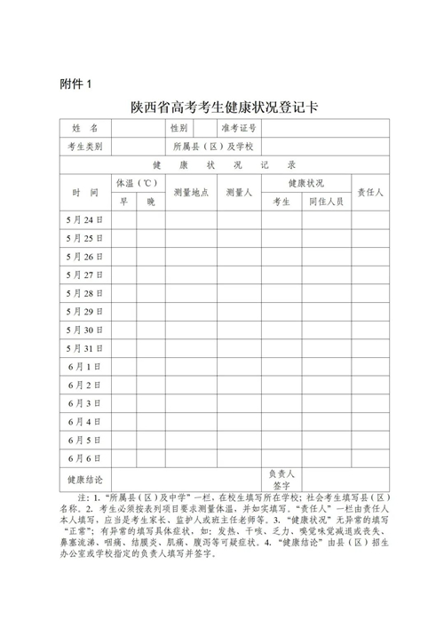 健康監(jiān)測。考生在高考前14天到高考結(jié)束應進入靜態(tài)管理,堅持做到非必要不流動,不到人群流動性較大的場所活動,不接觸有疫情風險的人員,做好每日體溫測量、記錄并進行健康狀況監(jiān)測,填寫《陜西省高考考生健康狀況登記卡》(附件1)和《考生健康承諾書》(附件2)。考生健康如出現(xiàn)異常狀況應立即向?qū)W校和高考報名地考試機構(gòu)報告,不得謊報、瞞報。