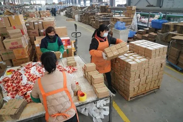 2月6日,陜西美農(nóng)網(wǎng)絡科技有限公司的工人在物流倉內(nèi)打包食品快遞包裹。(新華社記者邵瑞 攝)